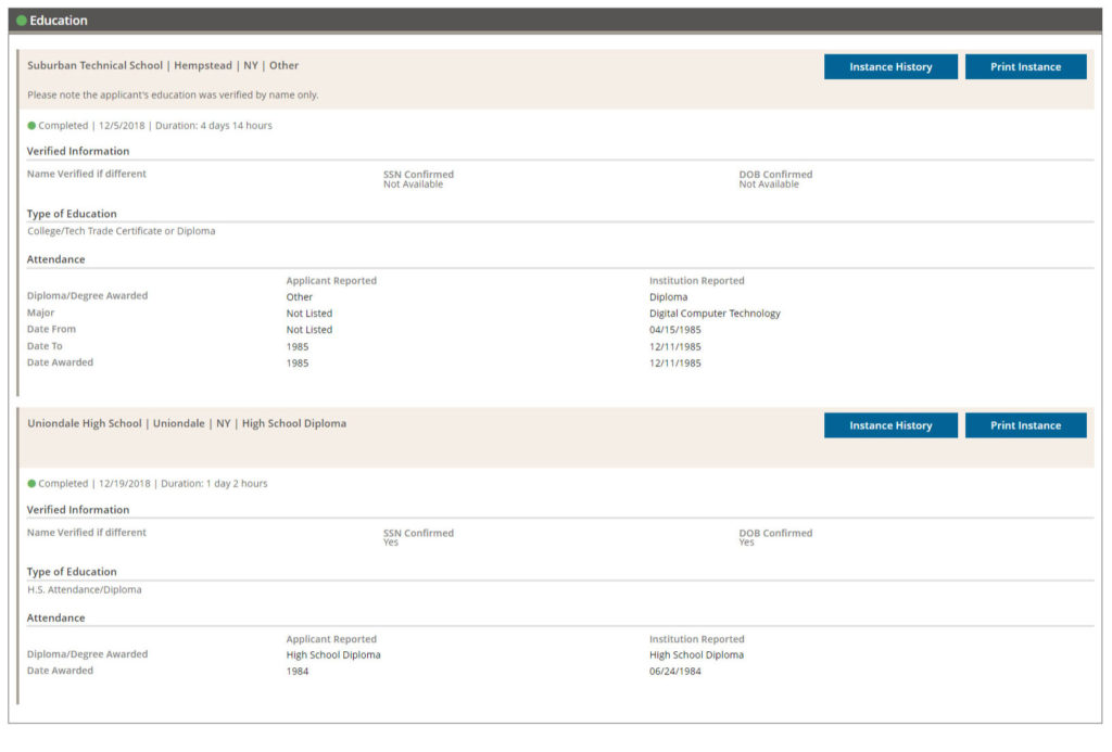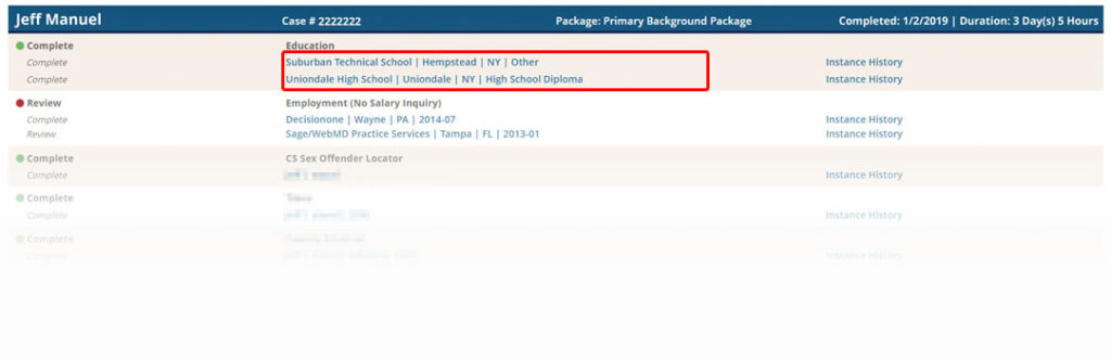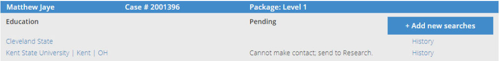 In addition, each instance within a case (i.e. each education or employment verification) contains its own action history log. Click the “history” link (under the “Add new searches button”) to access this information.