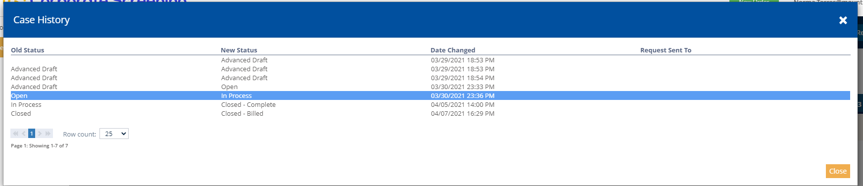 Each instance has its own action log, so you can stay up-to-date on a case’s progress. To close out of the history pop-up box, click the “back” button or the “X” on the top right of the box.